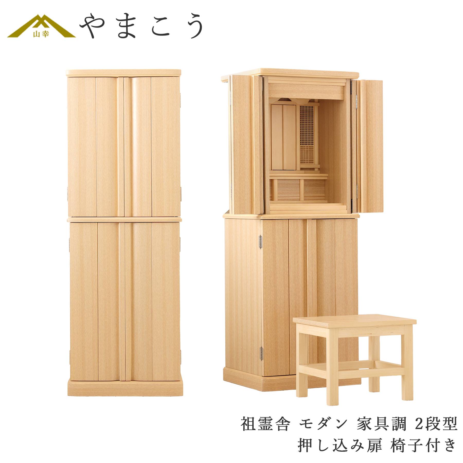 ■祖霊舎 神徒壇 単品 モダン 家具調 2段型 椅子付き LEDライト付き 引き出し 収納付き スライド棚 押し込み扉 タモ 高さ135cm×幅48cm 神