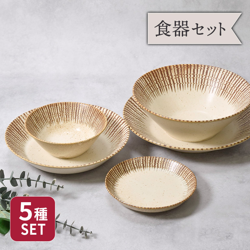 商品説明温かみのある和食器セットです。セット内容中皿/大皿/カレー・パスタ皿/中鉢/大鉢各1点/合計5点商品詳細(サイズ)・中皿 直径14.3×高さ2.1cm・大皿 直径24×高さ4cm・カレー・パスタ皿 直径20.7×高さ3.8cm・中鉢 口径13.5×高さ5cm・大鉢 口径20.5×高さ7.5cm素材/磁器 質感/つややか 生産地/日本(美濃焼)電子レンジ・食洗機可オーブン・直火不可※サイズは全て外寸になります。※サイズ・重さなどは商品により誤差があります。ご注意※釉薬の垂れや、ムラが見られる場合がございます。※縁の色の濃さにムラが見られる場合がございます。※お客様のお使いのモニター設定、お部屋の照明等により実際の商品と色味が異なって見える場合がございます。※画像に含まれる小物は使用イメージのために使用しています。※不明な点がございましたら、お気軽にお問い合わせ下さい。