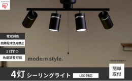 【配送不可:離島】1灯ずつ角度が調整可能で、家具などに当てることで、より立体感のある印象を与える4灯シーリングライトです。スポットライト型の為、特定の場所や物を際立たせることができ、向きは設置した後も調整可能です。スタイリッシュなモダンスタイルの空間におすすめです。プルスイッチで明るさが簡単に切替できます。明るさ切替は4段階でき、各シーンにあった調節が可能です。雰囲気をがらりと変えたいなら、電球の交換がおすすめです。工事が不要で、今お使いのシーリングライトから付け替えが簡単にできます。マットブラックとメタリックシルバーの2色展開です。<アイリスオーヤマ製品について>大河原町は、アイリスオーヤマ株式会社が県内で最初の創業地であるという歴史的経緯もあり、角田市の同意を得た上で共通返礼
