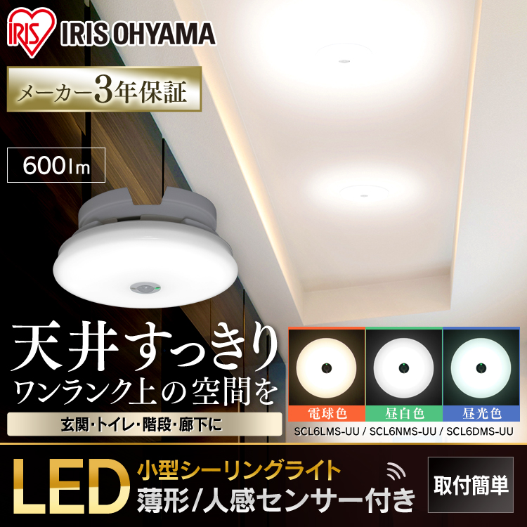 ■小型シーリングライト 薄形 600lm 人感センサー付 SCL6LMS-UU 電球色 昼白色 昼光色 小型 玄関 トイレ アイリスオーヤマ