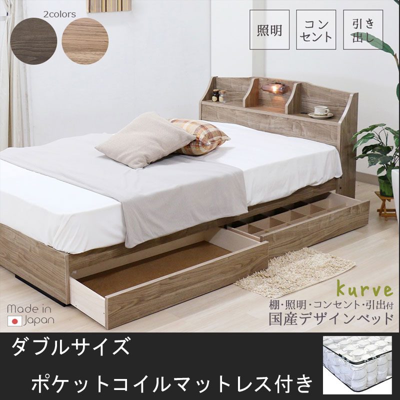 ■ダブルベッド ナチュラル ベッド 日本製 国産 収納付き 引き出し付き 照明 棚付き 宮付き 『FRANDER』 フランダー 海外製ポケットコイル