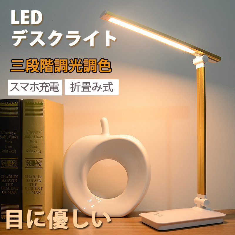 【目に優しい】平面発光の設計で、光をワイドに広がって、ダブルイメージ/ストロボ/グレアなど目に悪いことを防ぎ。長時間の仕事、勉強でも目が疲れにくい光です。 自然光に近い明るさは子供にも大人にもやさしい灯り。【3段階調光調色】タッチセンサー搭載、周囲環境に合わせて目に優しい光を自由に調整可能です。 自宅でも会社でもお店でも!パソコンにも読書にも、しっかり明るく照らしてくれます。【節電】消費電力は蛍光灯の約1/4です、電灯の寿命は蛍光灯の約8倍です。シンプルなデザイン。角度も自由に変えられる。【角度調節&耐久性】ヘッド部分、付け根部分の2ヵ所可動、高い可動性実現でき、使わない時もスッキリ収納が可能です。本製品は折り畳み式ですので、調節しやすい、収納しやすい、持ち歩きやすいなど色々と便利です。学習机やデスクワークにもオススメです。【便利、USBポート有】USBポートがあり、スマートフォン、iphone、ipod touchのUSB充電が可能。ポートの節約になります。*代金引換の利用する場合、商品代+260円の手数料を請求させていただきます。ご了承くださ