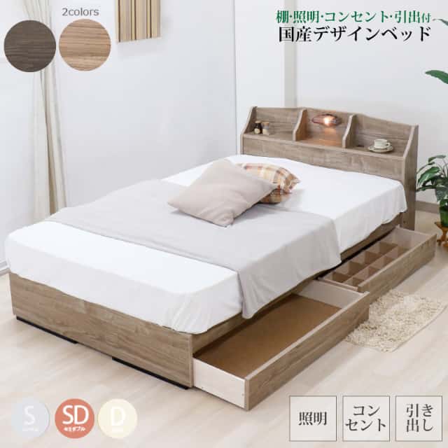 ベッド セミダブル マットレス付き 日本製フレーム 棚 照明 コンセント 引き出し付き デザインベッド 収納ベッド 茶 薄茶 【代引不可】おすすめのポイント・欲しい!が詰まった機能満載のベッド。・やさしく照らす枕元照明付き。・枕元にひとつは欲しい一口コンセントが付属。・大容量収納でしっかり収まる、床下引き出し2杯付き。・お部屋に合わせて選べる、2色のカラーバリエーション。・体圧分散性に優れた寝心地にこだわったマットレス付き。・フレームは安心の日本製です。送料無料でお届けいたします。(一部の地域を除く)