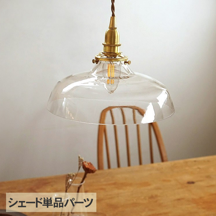 商品説明:しっかりとしたフォルム、厚手のガラスを使用した存在感のあるガラスシェード。肩部分からぐいっと広がる傘状のデザインは、力強く簡潔なデザインです。スタンダードなサイズ感は、4〜6人掛けダイニングテーブルの上に1灯で吊るすのにぴったりです。サイズ:約Φ243×H97mm灯具接続口径:約56mm重量:約740g材質:ガラスシェードタイプ:Type A別途必要なもの:・灯具(Type A対応用)・電球(灯具に合った口金径サイズ)注意事項:※こちらはシェードのみの商品です。照明としてお使いいただくには、別途「灯具」と「電球」のご購入が必要となります。※シェードの首部分にくびれがないデザインです。三点留め灯具のネジをしっかりと締めて、安定した状態で固定をして下さい。※工場で職人の手により生産しているものが多いため、黒点や気泡が入っているものもございますが、良品の範囲内とさせていただいております。