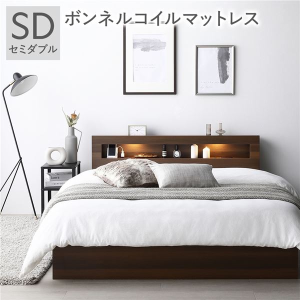 ■セミダブルベッド 茶色 ブラウン 茶 ベッド ボンネルコイルマットレス付 茶色 ブラウン 茶 照明 宮付 収納ベッド セミダブルベッド 茶色