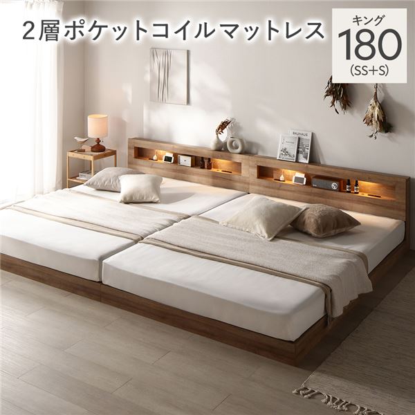 ■キングサイズベッド ベッド キングベッド 180 SS+S 2層ポケットコイルマットレス付 シャビーオーク 連結 低床 照明 宮付 すのこ 送料無