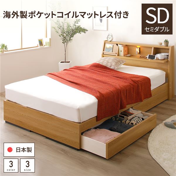 ■セミダブルベッド ナチュラル ベッド 日本製 国産 収納付き 引き出し付き 照明 棚付き 宮付き 『FRANDER』 フランダー 海外製ポケットコ