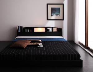 ■ダブルベッド ナチュラル、ブラウン、黒 ブラック、白 ホワイトから選べる 照明・棚付きフロアベッド ポケットコイルマットレス付き レ