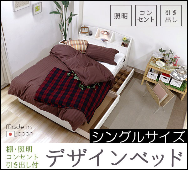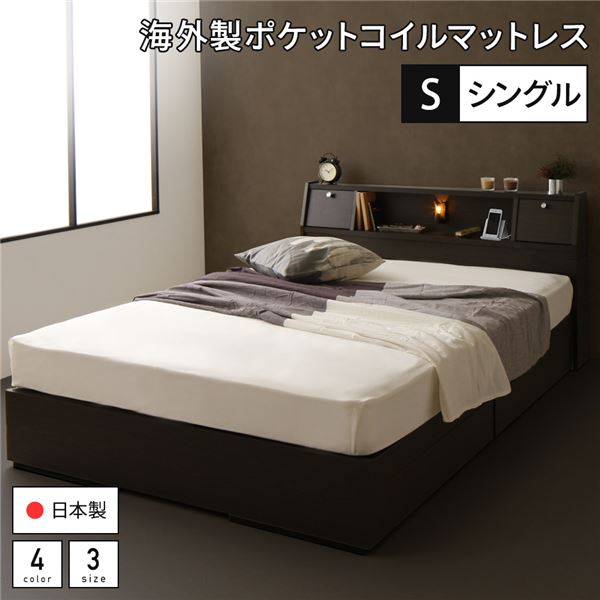 ■シングルベッド 茶色 ブラウン 茶 ベッド 日本製 国産 収納付き 引き出し付き 照明 棚付き 宮付き コンセント 海外製ポケットコイルマッ
