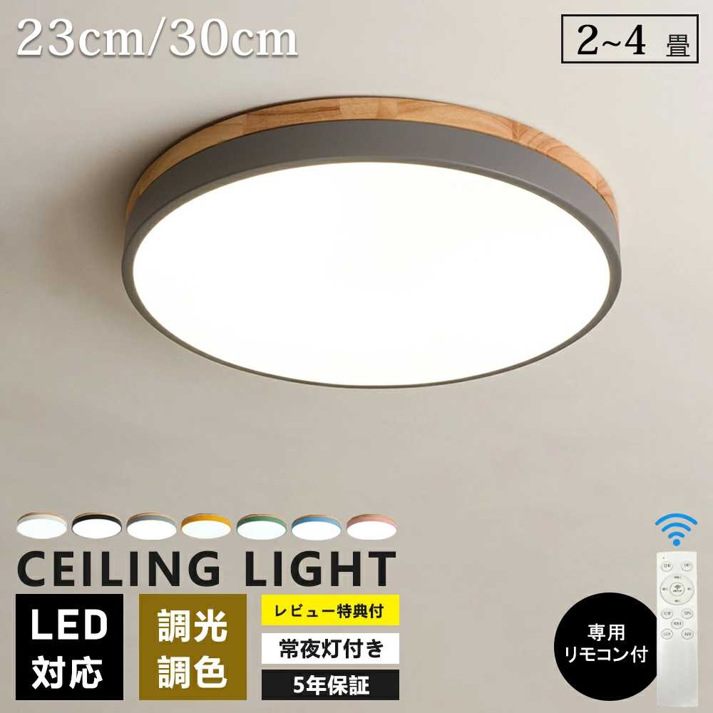 カラー:ホワイト/グレー/ブラック/ピンク/イエロー/ブルー/グリーン 材質:天然木/アルミ/アクリル 光源:LED 光色:昼白色、昼光色、電球色、三色切り替え、調光調色 ※調光調色のみリモコンついており、スマホ制御もできる。 サイズ: 23*5CM / パワー:12W / 適用空間:~2畳(タイプ2は23cmサイズがありません) 30*5CM / パワー:18W / 適用空間:~5畳