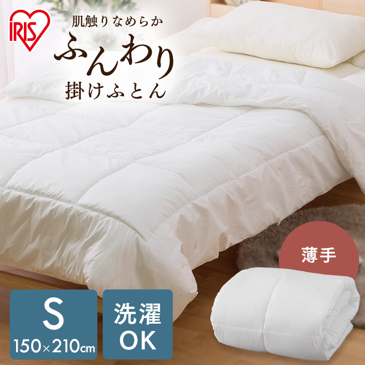 いつでも清潔、肌触りなめらか。ふんわり掛け布団[薄手]。シングルサイズ(150×210)/洗濯OK。●商品サイズ(cm)幅約150×奥行約210●充填量約600g●材質側生地・詰め物:ポリエステル100%側生地加工:ピーチスキン●洗濯表示・液温は30℃を限度とし、洗濯機で非常に弱い洗濯処理ができる・酸素系漂白剤の使用はできるが、塩素系漂白剤は使用禁止・タンブル乾燥禁止・日陰の平干しがよい・アイロン仕上げ禁止・ドライクリーニング禁止・非常に弱い操作によるウェットクリーニングができる●お取り扱い方法・本来の用途以外に使用しないでください。・本製品は丸洗いできますが、洗濯機を使用する場合、洗濯ネットを使用し、洗濯力の弱め設定で洗ってください。