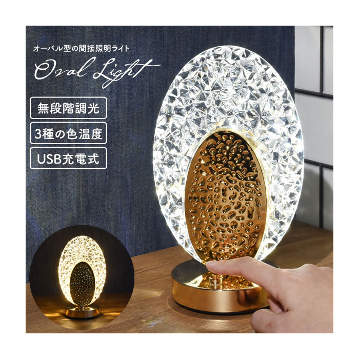 ライト 間接照明 オーバル型 ライト キラキラ 幻想的 アジアンテイストなオーバル型のキラキラした光が綺麗な間接照明のライトです。ボタン1つで簡単操作が可能です。ボタンをタッチする回数で色温度の変更が可能です。1回目電球色→2回目白色→3回目電球色+白色→4回目消灯します。1秒以上の長押しで明るさを調整することが可能です。ボタンから指を離したタイミングで明るさを固定することができます。付属のUSBType-Cケーブルで充電が可能です。面倒な電池交換の必要がありません。 サイズ(約):高さ22×横14×奥行10cm 重量(約):347g 素材:アクリル樹脂/LED 付属品:USB Type-Cケーブル(50cm)