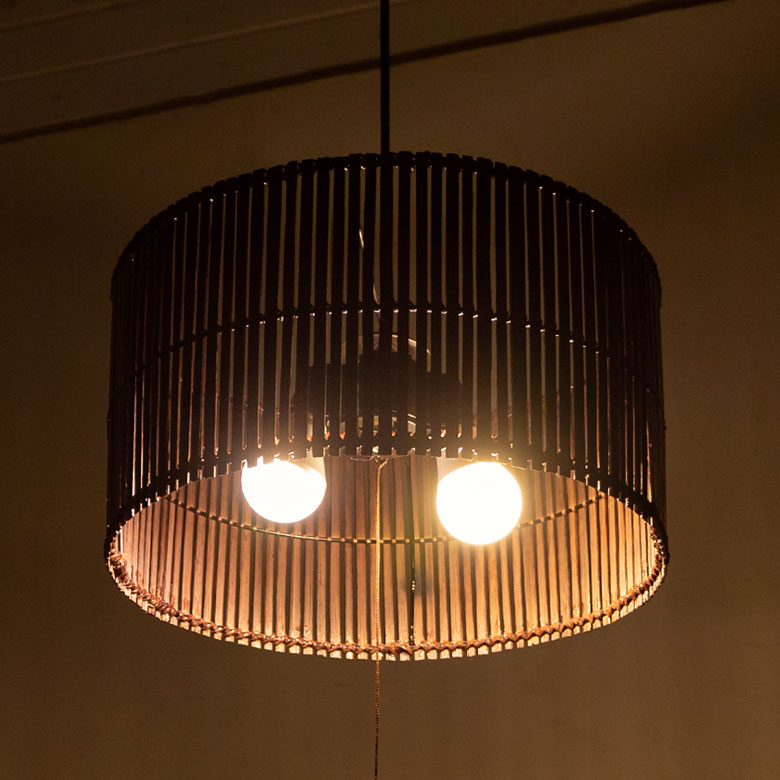 スライスしたバンブーを1本1本丁寧に編み、ハンドメイドで仕上げた、ムード溢れるペンダントライト。繊細なスリットから溢れる陰影が、情緒あふれるアジアン空間を演出します。深みのある落ち着いた風合いは、アジアンリゾートのインテリアはもちろん和風、モダンな空間など幅広い空間にマッチします。バリ島の夜を思わせる優しい灯りで、癒しのひと時を。■サイズ(cm):約 W 40 × D 40 × H 22※多少サイズは前後します。■重量:約 1kg■素材:バンブー、スチールフレーム■生産国:バリ(インドネシア)■付属品:2灯ペンダント用ソケットケーブル(長さ約0.5m) 引掛シーリングタイプ■備考:・電球:口金E26サイズ(2個ご用意ください)ソケットはPSEマーク取得済・豆電球:口金E12サイズ※100Wまで。※熱くならないLED電球を推奨します。※電球は別売りです。・コード:長さ約50cm、プルスイッチ付き■ご注意:商品ページ内「ご注意」をご覧ください。
