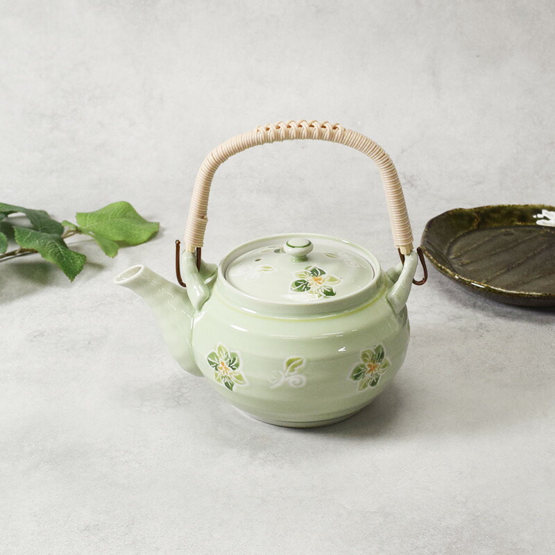 商品説明 草木の葉を思わせる淡いグリーンの急須。 シンプルな形状ながら、たっぷりとした610ccの容量で、4〜5人用に最適です。 和食やアジアン、中華料理のテーブルに自然に溶け込み、上品な雰囲気を演出します。 ファミリーでの団らんや、来客時のもてなし、業務用としても幅広く活躍します。 商品詳細 サイズ/口径7.4×17.1(持ち手含む)×高さ10.3cm 重さ/約370g 容量/約610cc(満水) 素材/磁器 質感/つややか 生産地/タイ 食洗機可 電子レンジ・オーブン・直火不可 ※サイズは全て外寸になります。 ※サイズ・重さなどは商品により誤差があります。 ご注意 ※鉄粉(茶色い点・黒い点)、ピンホール(小さな穴)、ボロ(小さな突起)が見られる場合がございます。 ※釉薬の垂れや溜まりやムラが見られる場合がございます。 ※お客様のお使いのモニター設定、お部屋の照明等により実際の商品と色味が異なって見える場合がございます。 ※画像に含まれる小物は使用イメージのために使用しています。 ※不明な点がございましたら、お気軽にお問い合わせ下さい。