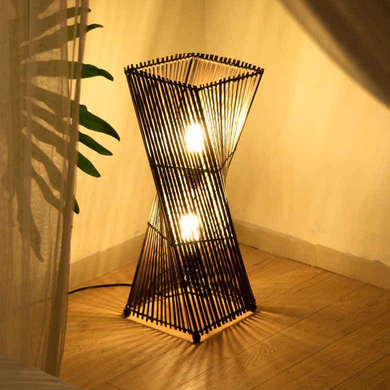 スライスしたバンブーを1本1本丁寧に編み、ハンドメイドで仕上げた、ムード溢れる間接照明。深みのある落ち着いた風合いは、アジアンリゾートのインテリアはもちろん和風、モダンな空間など幅広い空間にマッチします。■サイズ(cm):約 W 22 × D 22 × H 60 (電球出し入れ部分:約22cm)※多少サイズは前後します。■重量:約 1.1kg■素材:バンブー、スチールフレーム■生産国:バリ(インドネシア)■備考:・電球は別売りです。※電球2つ必要です(口金26サイズ 100Wまで)・ソケットはPSEマーク取得済・コード:長さ約1.9m、ON/OFFスイッチ付き■ご注意:※ハンドメイドのためサイズ・形が写真と異なる場合があります。※素材の特性上お届けする商品によって色・サイズが多少異なることがあります。※アジアン雑貨特有の小さなキズやヒビ・色むら等はご了承ください。※電球は熱くならないLED電球のご使用を推奨いたします。※天然素材を使用しているため、ささくれ等がある場合がございます。持ち運びの際は十分お気を付けください。