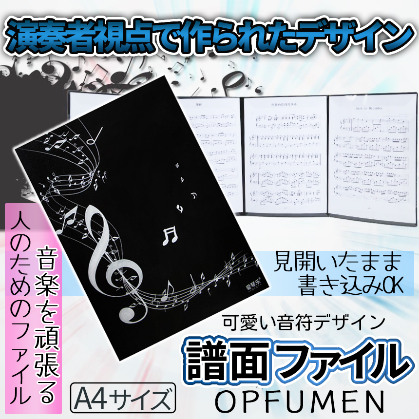 ■楽譜 ファイル 譜面 カバー 見開き 4面 最大 6枚 収納 書き込み A4 サイズ ピアノ 演奏 部活 吹奏楽 レッスン 練習 発表会 ライブ 弾き語