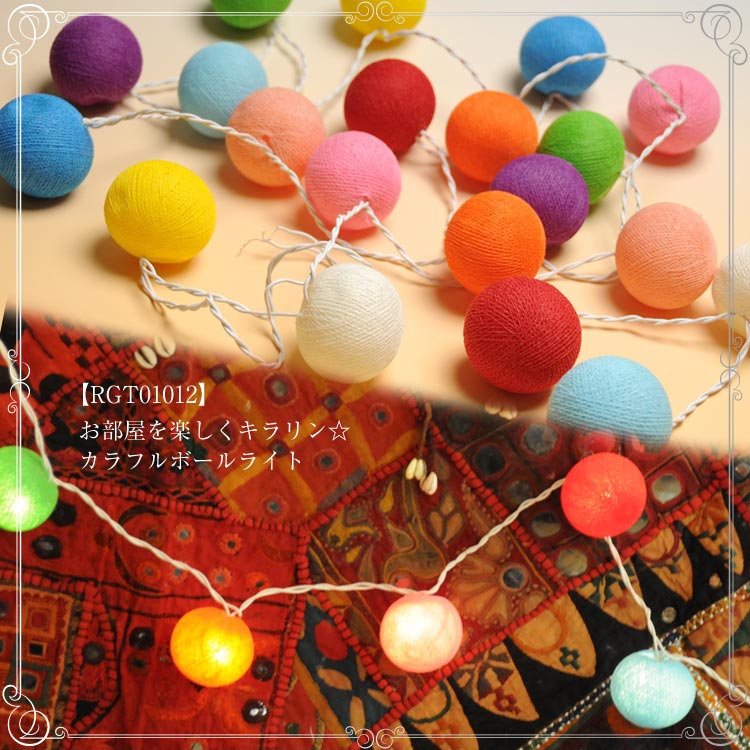 カラフルボールがポップに輝く可愛いディスプレイライト♪そのまま纏めて置いてあるだけでも、可愛らしいのです☆クリスマスツリーやお部屋を飾るオブジェにピッタリ!ご家庭はもちろん、お店のディスプレイ等いろいろな用途にどうぞ♪※100V仕様サイズ▼全長290cm前後ボール直径5.5cmボール間距離13-14cmボール数20個材質▼Plastic樹脂 タイ製送料▼宅配便 490/メール便NGですT T/お買上5,000以上で送料無料