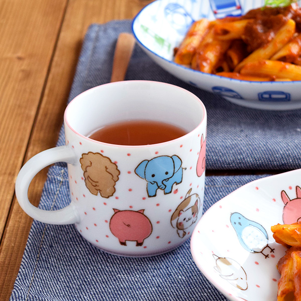 扱いやすい磁器の器に、可愛らしい動物のイラストがプリントされたキッズマグカップ。イヌ・ネコ・ウサギ・ブタ・トリ・ゾウのイラストがポップに描かれています。お尻を向けている姿はとってもキュート!これなら小さなお子様も、お父さんお母さんと一緒にお食事が楽しめますね。小ぶりなマグカップなら子供も持ちやすいので、毎日活躍してくれますよ。商品詳細サイズ/口径7.5×10.5(持ち手含む)×高さ7.5cm重さ/約180g容量/210cc素材/磁器生産地/日本(美濃焼)電子レンジ、食器洗い機使用可オーブン(直火)不可※サイズは全て外寸になります。ご注意※お客様のお使いのモニター設定、お部屋の照明等により実際の商品と色味が異なって見える場合がございます。※画像に含まれる小物は使用イメージのために使用しています。