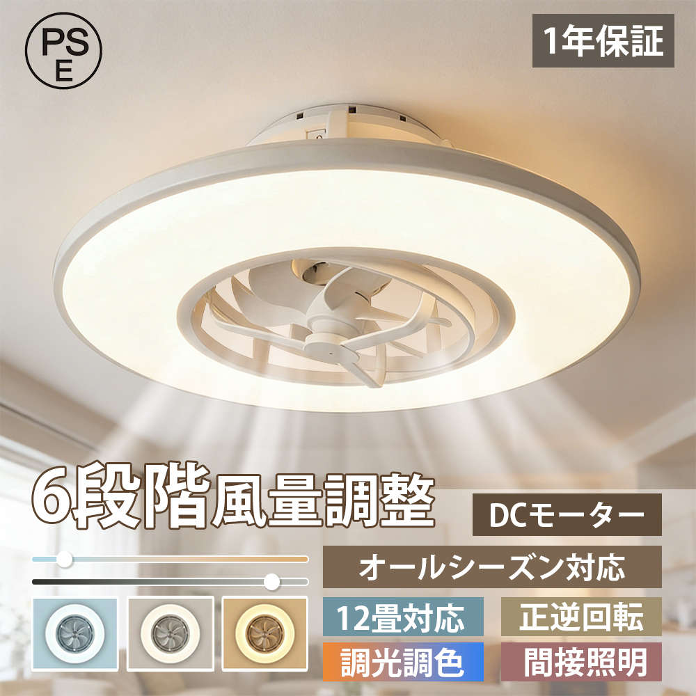 サイズ (約):直径 560mm × 高さ 195mm 重量 (約):3kg 電源:AC100V 50/60Hz 定格消費電力 (約): LED部:?45W (100%点灯時) ファン部:15W (風量最大時) 器具光束 (約):4500lm (ルーメン) ※100%点灯時 適用畳数:〜12畳まで対応 機能: ・調光機能 / 調色機能 ・風量調節 ・個別点灯切替 (メイン / 間接照明 / 全灯) ・DCモーター搭載 付属品:本体、リモコン×1、取扱説明書