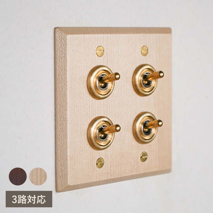 優しい雰囲気のウッドプレートと、真鍮製トグルの組み合わせがクラシカルで趣きのあるスイッチ。■スイッチのタイプ:トグルスイッチ■スイッチの形状:プレートタイプ既存の壁埋込み型スイッチからも付け替えやすい、平らなプレートタイプです。■スイッチの数:4スイッチ■配線関連:3路対応2箇所からON/OFFが可能です。サイズ:約W120×H120mm仕様:15A 125VAC、3路対応、PSE取得済み※国内スイッチボックス対応素材:アッシュ:アッシュ材、真鍮、他メープル:メープル材、真鍮、他セット内容:プレート、トグルスイッチ×4個、固定リング×4個、マイナスネジ×4本設置について:※スイッチの取付は電気工事士の資格が必要です。取付、取替は必ず電気工事店にご依頼をお願い致します。※取り付けの際、電動ドライバーを使用しないでください。※通常の埋込BOXに取付できます。注意事項:※天然素材のため仕上色に個体差がございます。
