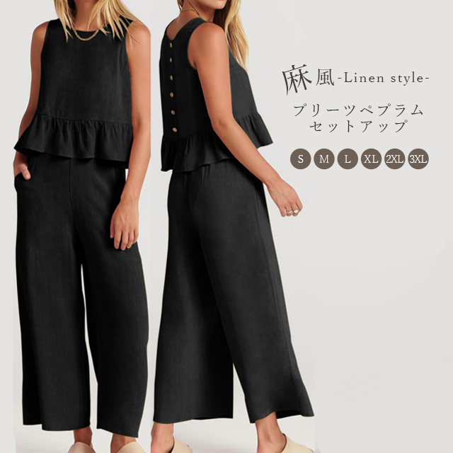 ■送料無料 冬新作 リネン セットアップ レディース カジュアル 夏 パンツドレス 2点セット ブラウス 綿麻 パンツ きれいめ ノースリーブ