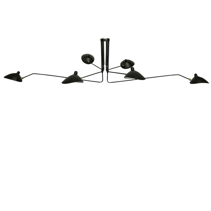 [サイズ]W280x D170x H70cm ※アーム可動式の為、サイズは最大値を記載しております。 電球サイズ E26 60W 電源 シーリングソケット[素材]アルミニウム、スチール[カラー]ブラック[送料]全国一律無料(沖縄・離島は配達不可)[商品説明]パリを代表する照明デザイナー、Serge Mouilleの初期の作品である、固定式の「Araignees」シーリングライト以来、4年の歳月をかけたのち1958年にセルジュ自身が納得の行くアームの動きを実現させた、SUSPENSION 6 BRAS PIVOTANTS。6本それぞれ長さの異なるアームは、リフレクターの位置を変化させることでアームを旋回させ、どんな状況にも光を合わせて照らすことができます。当時モダンアートを先駆けていたイタリアンデザインへの対抗として製作されたこの照明は、その挑発的で奇抜にも見える綿密に設計されたデザインによって、視覚的存在を備えた最先端の照明として、その斬新さは今でも衰えません。※シェードは回転させて向きを調整できますが、360°以上回転させることは断線の原因になりますのでご注意ください。※大型照明となって