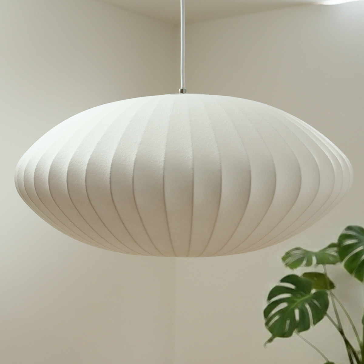 バブルランプ ソーサー ペンダント ミディアム 照明 ライト おしゃれ ミッドセンチュリー デザイナーズ ジョージ・ネルソン 家具 インテリア リプロダクト CS102B【お取り寄せ】 【DETAILS】 世界のミッドセンチュリーファンに50年たった今も圧倒的な人気を誇るジョージネルソンのバブルランプです。 ぱっと目を引くフォルムをしたシェードの部分は軽量で丈夫なスチールワイヤーを使用し流れるような流線を描き、特殊な樹脂を吹き付けて完成させます。不織布のような見た目ながら、弾力があり柔らかいゴムのような質感になっています。 柔らかくあたたかな光を放ち、空間にエレガントな印象を与えます。モダンな雰囲気もあり、和紙のような見た目も相まって日本の住環境にも合うランプとなっています。 スモールサイズと高さ違いで設置するコーディネートもおすすめです。