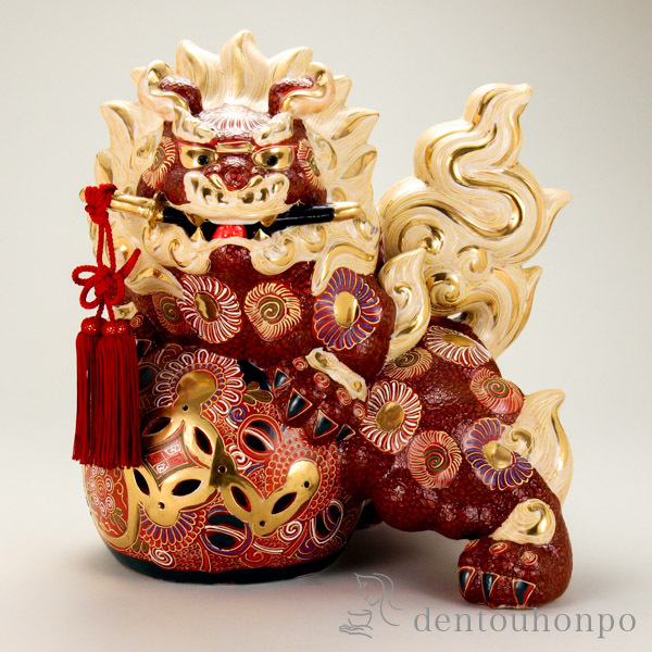■「送料無料」 九谷焼 剣獅子 盛 12号 ( 木札名入れ有料 退職祝い 定年 置物 玄関 受付 風水 幸運 九谷焼 結婚 出産 内祝い )
