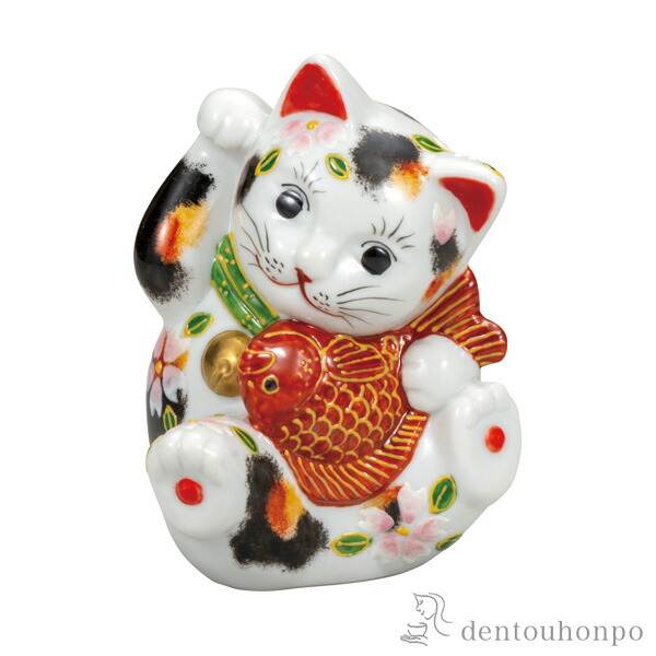 ■「送料無料」 鯛招き猫 三毛盛 3.8号 ( 木札名入れ有料 置物 幸運 開運 まねきねこ 風水 九谷焼 結婚 出産 内祝い 引き出物 金婚式 )