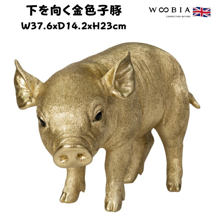 下を向く金色子豚本体: 37.6 x 14.2 x 23cm (幅x奥x高)パッケージ: 42.5 x 18.5 x 27.5cm (幅x奥x高)重量:1450g素材:ポリレジン【ブランド「ウービア」(woobia)について】1998年にイギリスで創業したブランドです。自然と人間、そして動物との関係をとても大切にし、「自然は人間の豊かさに欠かせない存在である」という変わらない想いのもと、まるで命が宿ったかのような動物たちを制作。その想いから創られたオーナメントは、芸術的な発想力、洗練されたデザイン、鮮明な色使いで職人の技術によって実現された工芸品です。動物たちはリアルな質感で、豊かな表情をしています。ぜひ、ウービアの製品であなたの生活に彩りを加えてください。【用途】玄関、玄関先、お庭などお家のインテリア、置き物として大活躍です。また、会社やお店のインテリアとしても迫力を発揮します。動物好きの方へのプレゼントギフトにぴったりです。大きいサイズでインパクト大です。