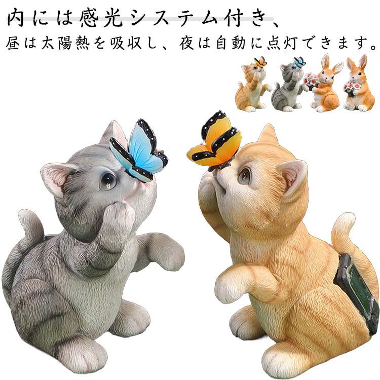 ■屋外 ソーラーライト ウサギ 蝶 置き物 動物 オーナメント 庭 ガーデン雑貨 猫 置物 樹脂 工芸品 庭園 装飾品 花園 ソーラーライト 可愛