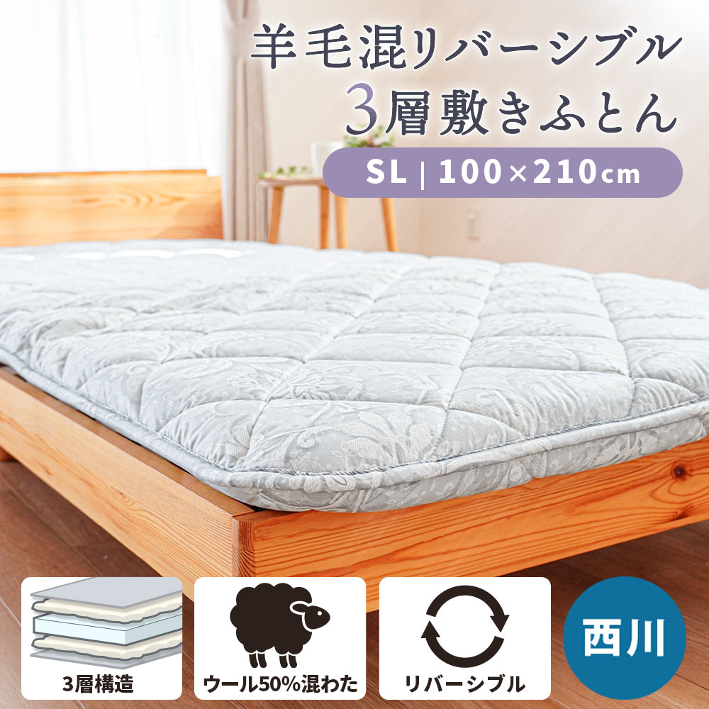 ■【再値下!】西川 敷布団 シングル 羊毛混三層式固綿入り 敷き布団 シングルロング 合繊入りウール敷き 100×210フランス ウール ダマス