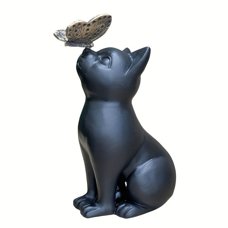 ■オブジェ 置物 蝶が止まっている黒ネコ 猫 ガーデンオーナメント インテリア 可愛い インテリア雑貨 室内 寝室 玄関 アニマルオブジェ 庭