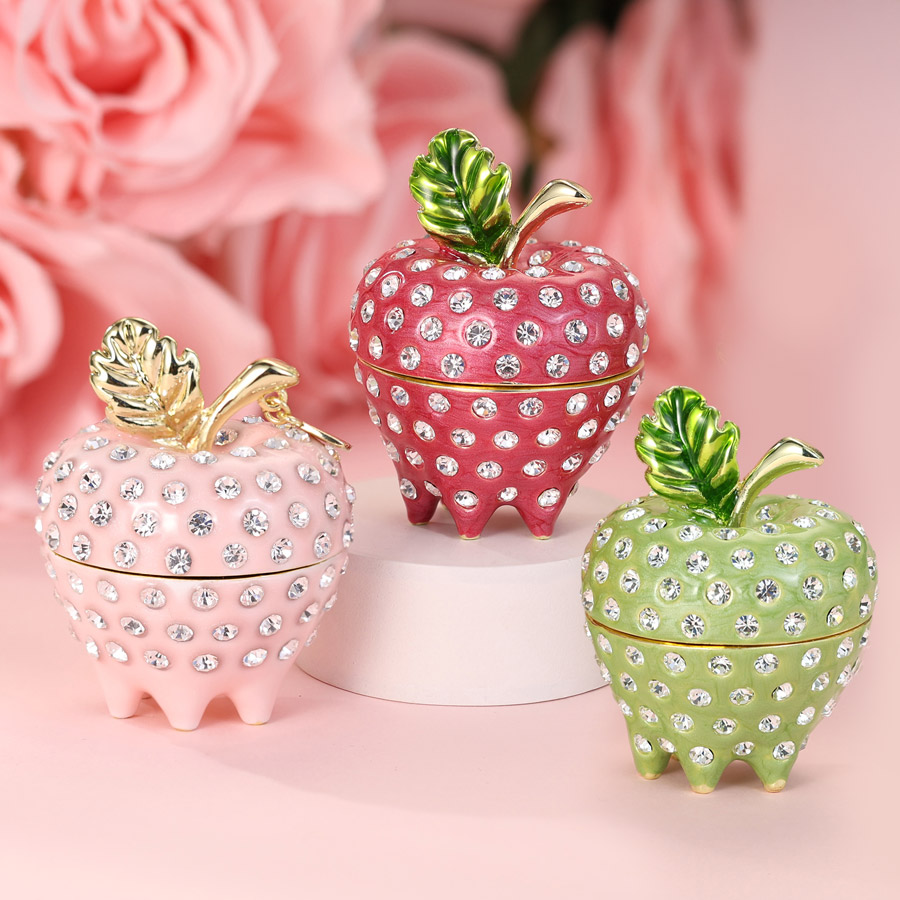 アップルのジュエリーボックスは、愛らしいリンゴのフォルムにゴールドの葉をあしらい、全体にきらめくクリスタルを散りばめた華やかなデザインです。 光を受けてきらきらと輝く姿は、飾っておくだけでもインテリアとして存在感を放ちます。 蓋を開けると、小さなリングやピアスを収められる収納スペースが現れ、大切なジュエリーを可愛らしく守ります。 手のひらに収まるコンパクトなサイズは持ち運びにも便利で、サプライズギフトにも最適。 小物をしまう実用性と、飾るだけで心をときめかせる美しさを兼ね備えたアップルジュエリーボックス。 特別な瞬間を演出し、毎日の暮らしをより華やかに彩ります。 ●サイズ:約40×40×55mm ●素材:合金、クリスタルガラス ※掲載画像は実物となるべく同じ色合いを再現するようにしておりますが、PCの環境で若干色が現物と異なる場合がございます。 ※ひとつひとつ手作業で生産しているため、生産時期によって、塗料の色合い・クリスタルの濃淡・内側の色や模様などが掲載画像とは多少異なる場合がございます。