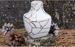 この小さな花瓶は、森で忘れ去られていた器の山から最初に見つけ、ミミズプロジェクトのきっかけとなったものです。 花瓶の形は小ぶりで愛らしく上品で、小さな野の花を挿したら、そこは春です。 ゴールドラインのほかにも秋色、すすきのバリエーションがあります。 提供:ジェレミー パレ ジュリアン