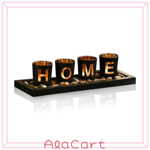 ■MrMrKura キャンドルホルダー 4個セット小石付き キャンドルスタンド ガラス 燭台 キャンドルホルダー トレイ付き ブラック 蝋燭立て ホ