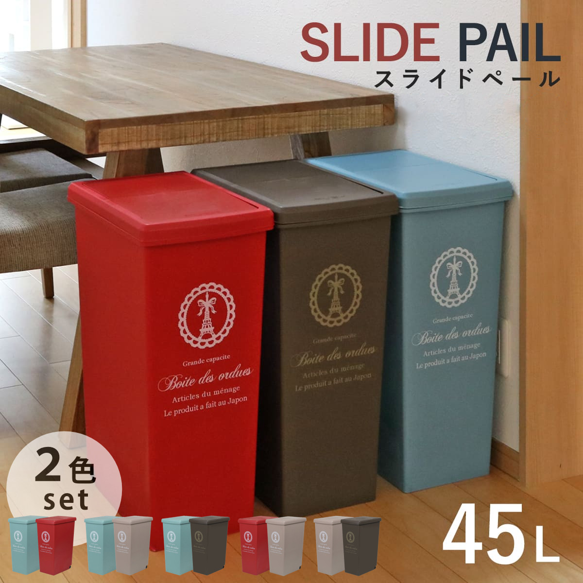 ■ゴミ箱 スライドペール 45L 色違いセット ( ごみ箱 45リットル ダストボックス スリム 分別 キッチン スライド スライド式 蓋つき 大容