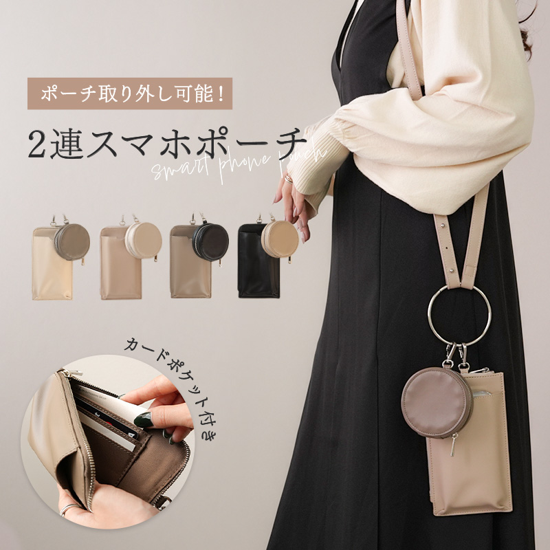 ■スマホポーチ 2連 スマホ ポーチ サコッシュ 小物入れ カードポケット 取り外し可能 斜め掛け 肩掛け 無地 シンプル スマホストラップ