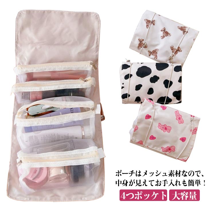 ■化粧ポーチ 4つポッケト 機能的 メイクポーチ 旅行ポーチ 小物入れ 収納 大容量 吊り下げ トラベルポーチ 撥水 道具入れ 壁掛け 折り畳み