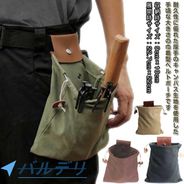 腰袋 PU 巾着型ベルトポーチ ベルトバッグ 厚手キャンバス シンプル ダンプポーチ 折畳み可 巾着型ベルトポーチ 小物入れ 巾着袋 収納 軽量 軽い 無地 丈夫 園芸 作業 多目的ポーチ アウトドア 実用的 ブラック ベージュ グリーン ブラウン