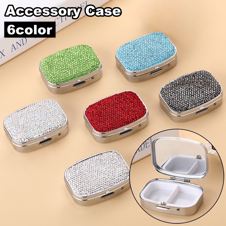 ■アクセサリーケース 小物入れ コンパクト ミニサイズ 持ち運び 携帯 ミラー 鏡 仕切り付き 四角 スクエア ラインストーン キ