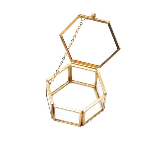 ■六角形 ジュエリーボックス 宝石箱 収納ボックス 透明 黄銅 蓋付き 小物入れ ジュエリーケース ガラスボックス ジュエリー収納 ゴールデ