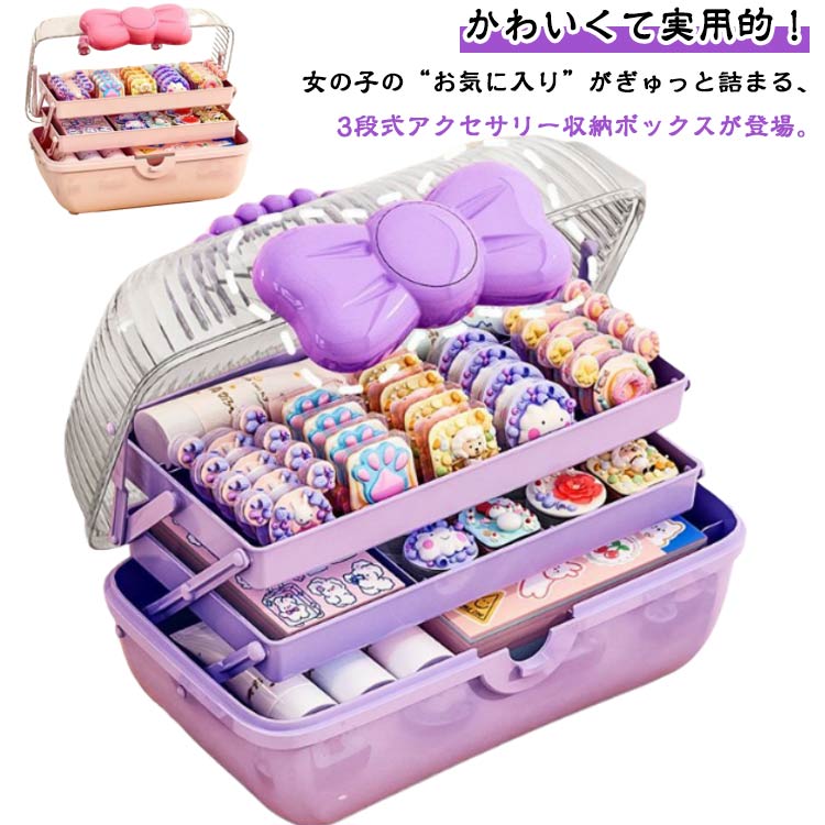 ■キッズ 小物入れ 小物入れ 可愛い ジュエス 大容量 ハンドル付き 3段 指輪ケース ヘアゴム ジュエリーケース ヘアピン リボン たっぷり収
