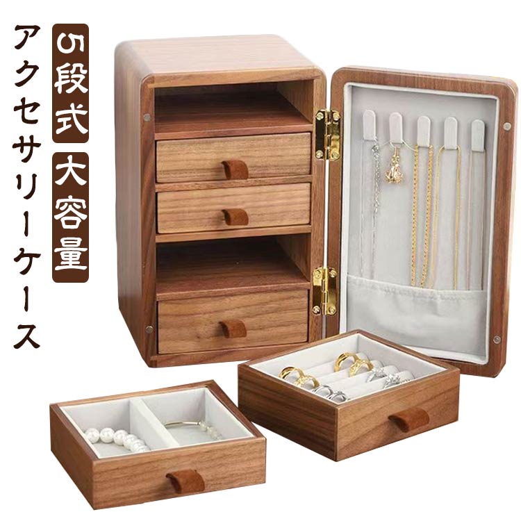 ■オーガナイザー ドア付き 大容量 5段式 アンティーク調 木製 ジュエリーケース 引き出し ジュエス 指輪 リング ピアス イヤリング ネック