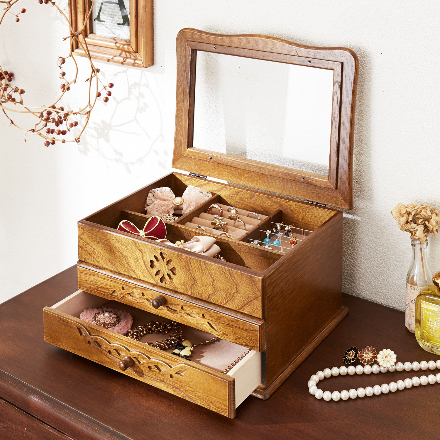 美しい天然木の質感と、クラシックな雰囲気ただようデザインが魅力レトロな印象の天然木・栓(セン)材とナラ材の突板を組み合わせた、異なる木目感を楽しめるジュエリーケースです前板にあしらわれた細やかな彫りのデザインが、女性らしい優美な表情を与えるこだわりのつくりフタ部分はガラス張りになっているので、フタを閉めたままでもお気に入りのジュエリーをいつでも眺めることができますさらに、仕切り付きで指輪やピアスなど分類しながらオシャレに収納OK2杯ついた引出しにもたっぷり収納でき、内側はすべてフェルト貼りになっているから、大切なコレクションがキズつくのを防いでくれます