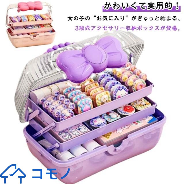 髪飾り 小物入れ 小物入れ 指輪ケース ジュエリーケース アクセサリー収納ケース 可愛い 3段 リボン ジュエス ジュエス ヘアピン ヘアゴム たっぷり収納 大容量 ハンドル付き 持ち運び便利 女の子 小学生 園児 子供 ガールズ