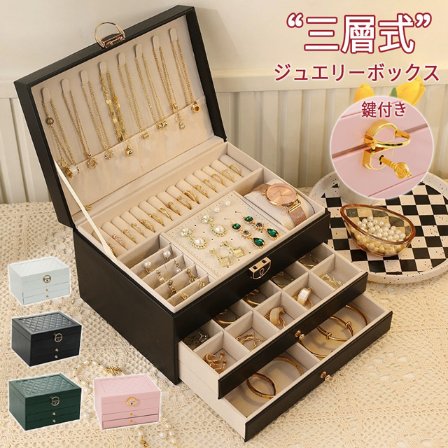 「クーポン配布中」3段 ジュエリーボックス レザー ジュエリーケース アクセサリーボックス アクセサリーケース アクセサリートレイ 宝石箱 ネックレス 収納ボックス 小物入れ 鍵付き 大容量収納 母の日 ギフト 敬老の日