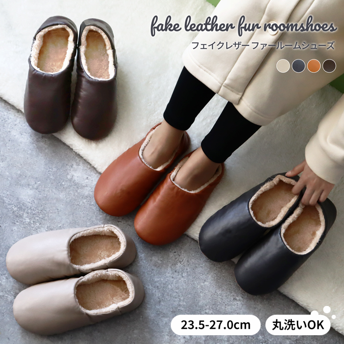 ■スリッパ レザータッチ ルームシューズ レディース メンズ 男女兼用 室内履き フェイク レザー ファー 北欧風 肌触り 滑り止め^bm1404^