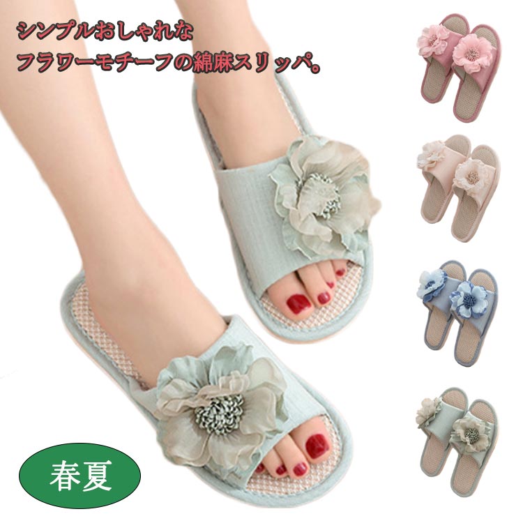 ■ルームシューズ スリッパ 夏用 室内 送料無料 麻 前開き リネン レディース 花 リネンスリッパ 消音 軽量 滑りにくい 来客用 インテリア