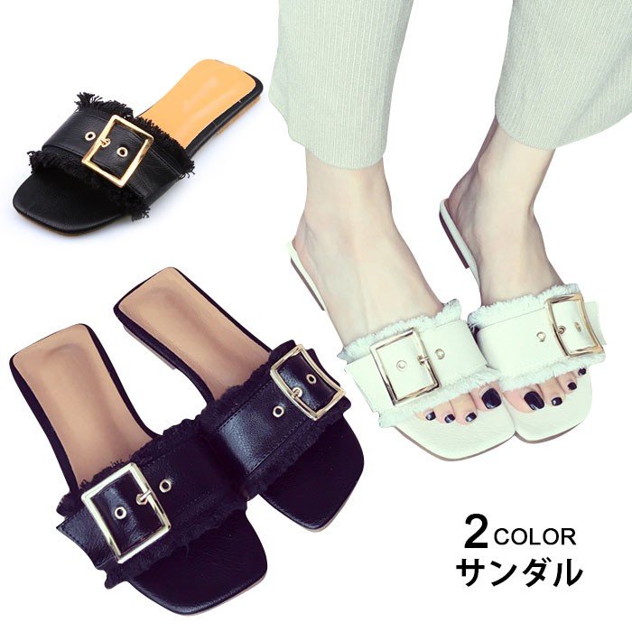 ■サンダル レディース フラットサンダル スリッパ フリンジ付き ローヒール フラットソール PUレザー フェイクレザー クッション性 疲れに